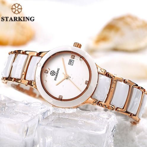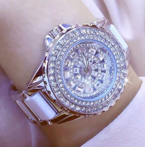 Ako volite satove sa Swarovski kamenjem, svidjet će vam se ovaj sjajni dodatak s AliExpress. Predstavlja ga malo poznati kineski brand specijaliziran za satove različitih stilova. Model prikazan u ocjeni je uokviren stvoreni su prelijepi kamenčići i delikatni uzorci umetci kubičnog cirkonija. Svjetlucanje kamenčića usklađuje se s keramičkom narukvicom. Na AliExpress takvi ženski satovi mogu se kupiti u zlatnoj ili srebrnoj boji. Obje opcije su prikladne za večernju haljinu.