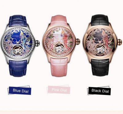 Tijelo je ukrašeno cvjetnim i životinjskim elementima. Lijepi rhinestones ga ukrasiti. Satne podjele nisu, vrijeme je prikazano s tri ruke. Dio brojčanika ostaje otvoren. Kroz rupu možete vidjeti pokretne elemente satnog mehanizma. Sat je pričvršćen na žensku ruku s mekanim remenom od prave kože. Njegova boja odgovara dizajnu kućišta i brojčaniku.