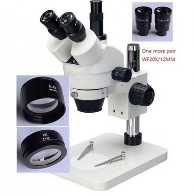 Na AliExpressu nema previše trinokularnih stereomikroskopa, ali među njima ovaj model zauzima vodeće mjesto.Zapravo, radi se o dalekozoru s dodatnim okularom za fotoaparat i vrlo kvalitetnim objektivima. Kupci vole ne samo sam uređaj, već i zgodan objektni stol. Pogodan je za proučavanje predmeta i lemljenje manjih dijelova, ima dovoljno mjesta za lemilo i pincetu. Žarišna duljina se podešava ovisno o korištenim objektima, vidno polje je široko čak i pri maksimalnom povećanju. Za praktičnu uporabu opreme postoje gumeni zaklopci za oči.