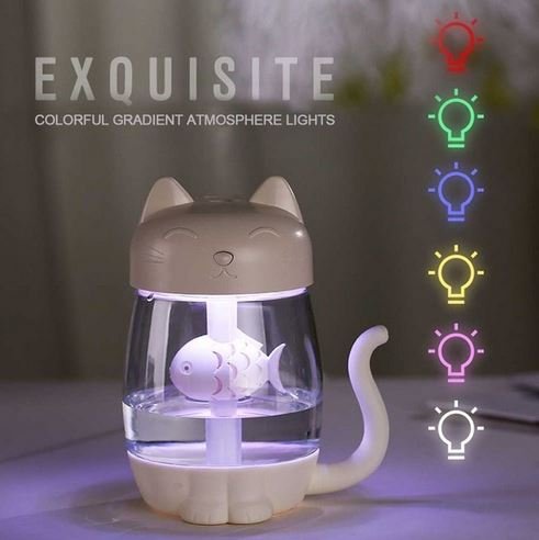 Ovaj mini-ovlaživač je najbolja opcija za dječju sobu. Radi na principu generatora pare. Uređaj je tih, potpuno bezopasan i kakav je divan dizajn! Oblik uređaja podsjeća na igračku-mačku, u trbuhu od koje riba prska. Kako voda iz unutarnjeg spremnika isparava, riba se pomiče. Djeca vole gledati njezine avanture. Uključen je USB kabel i ventilator.