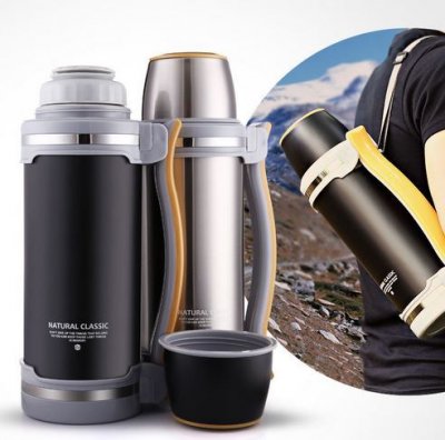 Takva termos je dizajnirana za veliku obitelj ili tvrtku. Može stati i do 4 litre pića. Vakuumska posuda ojačana i čvrsto zavarena unutar termosice. Kada se trese, zvecka. S tako velikom količinom to je važno. Poklopac je zapečaćen, sadržaj se ne prosipa ni nakon okretanja termosice. Postoji ventil za brzo otvaranje koji pojednostavljuje pristup piću. Pluto ne pada i ne ispada, drži se na velikoj niti.