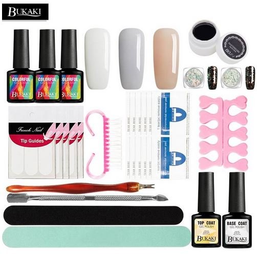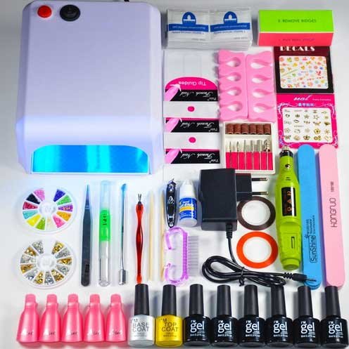 Takvi setovi, u pravilu, uključuju gelove od nekoliko boja, bazu i završni premaz. Ponekad prodavači također uključuju uklanjanje laka za nokte, sredstva za odmašćivanje, datoteke za nokte, štipaljke i druge alate za manikiranje. Svjetiljka za sušenje laka mora se kupiti zasebno. Veliki plus takvih kompleta je najbolja kompatibilnost laka, vrha i baze.