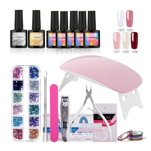 Ovaj set kvalitetnih gel-laka tvrtke Rosalind dopunjen najkompaktnijim LED-lampa pronađena na Aliexpress web-mjestu. Njezino ime je Sun-mini, a ona je poznata po dobrim performansama. Snaga uređaja je samo 6 W, ali se nosi sa svojim zadacima - suši sve slojeve savršeno.Noge svjetiljke su preklopljene tako da je prikladno uzeti ga na put. Povezuje se s mrežom putem adaptera, za to je prikladan punjač iz telefona.