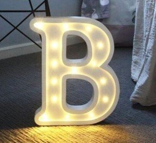 Svjetleća slova - jedna od najoriginalnijih opcija za poklone. Od njih možete napraviti bilo koju riječ koja će uvijek podsjećati mamu na njezinu voljenu djecu. Asortiman prodavatelja ima sva slova engleske abecede i brojeve. Visina svake svjetiljke je 22 cm, a tijelo je izrađeno od plastike. Unutra su LED diode s toplim žutim svjetlom. Na poleđini se montiraju kako bi se proizvod objesio na zid. Prodavač jamči vijek trajanja noćnog svjetla dulje od 50.000 sati. Da bi slova bila sjajna, potrebna su vam dva baterija prstiju (nisu uključena).