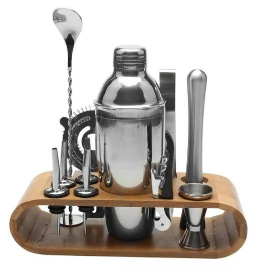 Ovaj set će biti vrlo spektakularan i neobičan poklon za majku, koji često organizira druženja s prijateljima ili članovima obitelji. Obuhvaća 12 artikala namijenjenih za proizvodnju koktela: žličica za šipku, šejker, mjerne posude i mlaznice za boce. Gotovo sve komponente su izrađene od metala, prilično tanke, ali izdržljive. Tu je i vadičep, upute za uporabu i drveni stalak za spremanje kompleta.