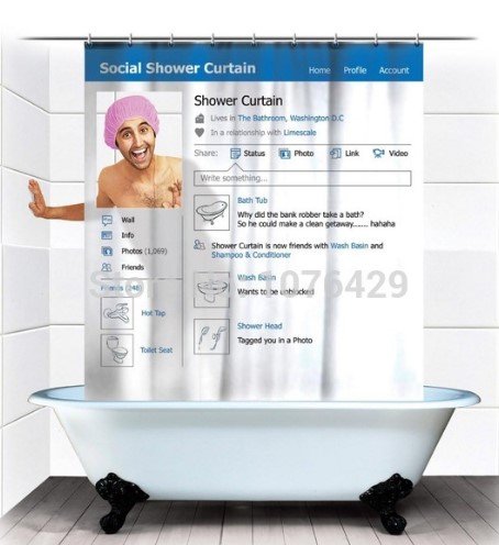 Ova čudna zavjesa za tuš će biti najbolji poklon za one koji ne žele napustiti profil svoje društvene mreže čak i za vrijeme vodenih procedura. Ovaj proizvod ne može se nazvati novost, ali je zaslužio svoje mjesto u ocjeni zbog neobičnog dizajna. Ispis zavjese u stilu društvenog mrežnog profila "Facebook". Ovdje se nalazi sve što je potrebno - status, popis prijatelja, zid, i naravno, interaktivni avatar. Ili bolje rečeno - prozirni prozor od polietilena, kroz koji je vidljiv taj dio tijela koji želite prikazati. Sve ovisi o visini osobe i visini na kojoj će visjeti zavjesa.