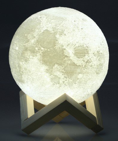 Svjetiljka u obliku mjeseca bit će izvrstan dar za astronome, ljubitelje svemira i sve ljude koji vole stilske i lijepe stvari. Izgleda sjajno na fotografijama, možete odabrati odgovarajući promjer lopte - 8, 10, 12, 15, 18 ili 20 cm. Snaga uređaja - 0,5 W, radi s ugrađenom baterijom kapaciteta 240 mAh. Baterija se napaja preko USB-a, potrebno je 6-8 sati za punjenje, nakon čega će „mjesec“ zasjati do 30 sati uz minimalnu svjetlinu.