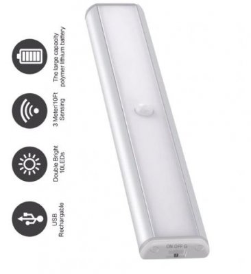 Dovoljno je usmjeriti oko senzora prema vratima ormarića, i svaki put kad se otvori, svjetlo će se upaliti unutra. Maksimalna udaljenost do objekta je tri metra, odnosno svjetiljka se može koristiti ne samo u ormarićima, već iu malim sobama. Osim toga, uređaj odmah 10 dioda s ukupnim kapacitetom od 100 lumena. Zapravo, to je jako puno, ali zahvaljujući matiranom staklu svjetlo svjetiljke postaje raspršeno i nenametljivo. Volumen ugrađene baterije u kućištu je 850 miliampera. To omogućuje uređaju da radi do 10 sati bez punjenja, a pod uvjetom da bude instaliran na mjestima s rijetkim pristupom, to je mnogo.