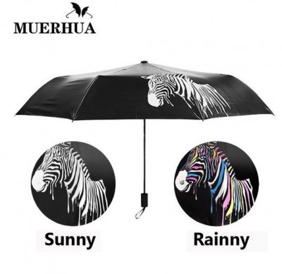 Tkanina koja mijenja boju sadrži posebne hidrokromne boje koje mijenjaju pigmentaciju ovisno o vlazi. Kišobran je velik kao dar. Prodavatelj na svojoj stranici stranice AliExpress preporučuje da ga koristite u kišnom i sunčanom vremenu. Oprema je vrlo čvrsta, tkanina je tanka, ali jaka. Prekrasan i neobičan pribor koji će odgovarati i muškarcima i ženama.