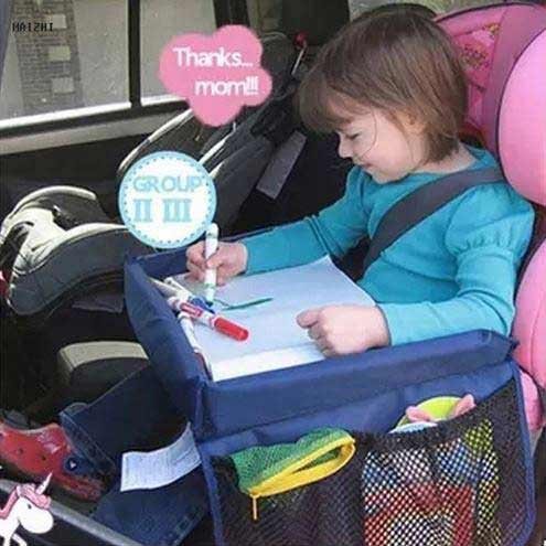 Djeca mogu crtati, igrati i gledati slike u automobilu ako opremite auto sjedalo s tako neobičnim stolom s Aliexpress. Kompaktan je, učvršćen stezaljkama. Duljina traka je podesiva, zasuni su pouzdani i sigurni. Odbijači bez oštrih rubova. Visina je dovoljna da objekti ne padnu. Materijal stola ima svojstva otpornosti na prašinu i vodu. Čvrsta je, dobro čuva svoj oblik i vrlo je lagana. Sa strane su prikladni džepovi koji igraju ulogu organizatora.