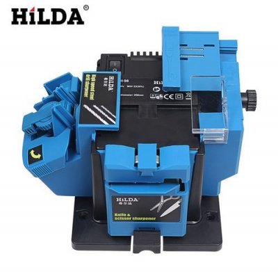Kompaktna oštrica za kućanstvo s Aliexpress s pristojnim značajkama. Najbolji u klasi za vraćanje oštrine alata. Kompletan komplet uređaja je kompletan - osim samog stroja za brušenje, kineski prodavatelj šalje mlaznice za oštrenje škare, noževa i dlijeta. Ovaj stroj "3 u 1"! No, glavna prednost modela je mogućnost centriranja i podešavanja kuta oštrenja. To uvelike proširuje opseg uređaja.