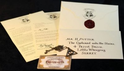 U pismu iz Hogwartsa nadaju se ne samo djevojčicama i dječacima, nego i odraslima koji su u ranom djetinjstvu obožavali knjige i filmove Harryja Pottera. Ovaj jednostavan dar učinit će neizbrisiv dojam na njih. U kompletu se nalazi pismo u omotnici s pečatom, bakreni privjesak sa značkom "smrtnih točkica" i vozna karta koja polazi s platforme 9.