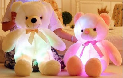 Ovaj medvjed će privući ne samo djecu, nego i mnoge odrasle osobe. Asortiman ima četiri boje - bijelu, žutu, ružičastu i plavu. LED pozadinsko osvjetljenje dovoljno je svijetlo, svjetluca u različitim nijansama. Medvjed radi s tri baterije, kako bi upalio svjetlo, potrebno je pritisnuti gumb desno od gornje šape.