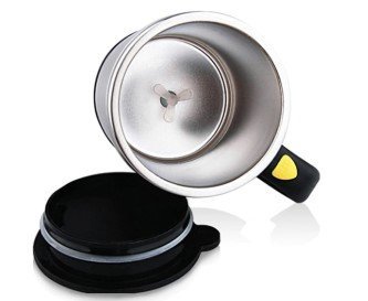 Osim toga, posuđe dolazi s poklopcem koji se ne može prolijevati, što omogućuje ne samo da se isključi slučajno prolijevanje pića, već i da ga se dugo drži toplim. Šalica je izrađena od metala i plastike, a hrana se dobiva iz dvije AAA baterije, koje je potrebno kupiti odvojeno. Kapacitet proizvoda je 350-400 ml, a težina je samo 270 grama. Budite oprezni kada pijete i ne dodirujte gumb, kako ne biste aktivirali funkciju miješanja i ne biste prosuli cijelo piće na sebe.