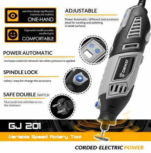 Glavna prednost ovdje je pogodan položaj gumba za napajanje i napajanje. Za promjenu načina rada ne koristi se standardni prekidač, već gumbi koji povećavaju ili smanjuju snagu. Da ne zaboravimo koji se mod trenutno aktivira, postoji nekoliko indikatora diode na kućištu, što ukazuje na to koje okretaje trenutno radi dremel. Također zabilježite položaj gumba za zaključavanje. Aktivira se jednostavnim pritiskanjem, a istovremeno nije potrebno staviti alat na stol ili ga osloboditi iz ruku. Sve radnje se izvode odmah, bez prekida rada. Jednom riječju, ovo je najbolji ergonomski model, malo inferiorniji u odnosu na konkurente, ali najpogodniji i atraktivniji izgled.