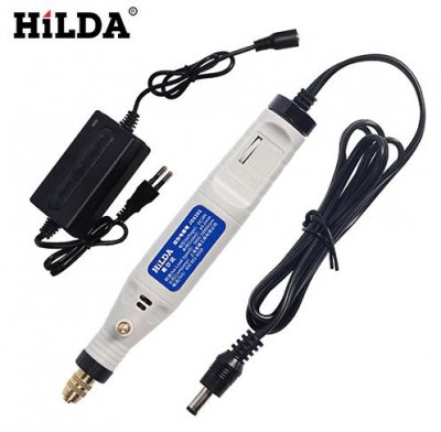 Tvrtka HILDA proizvodi mini bušilice u širokom rasponu. Od najmanjeg, veličine obične kemijske olovke, do najmoćnijeg, više podsjeća na punu bušilicu. Pred nama je prosječni model, namijenjen za stambenu uporabu, a ne za profesionalnu uporabu. Snaga motora je samo 140 W. To je sasvim dovoljno za brušenje ili bušenje, ali kod rezanja bit ćete ograničeni snagom motora.