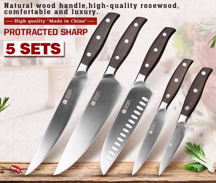 noževi XINZUO čini dostojnu konkurenciju liderima svjetskog tržišta. To su univerzalni rezni alati za kućnu uporabu. Set sadrži 5 noževa najpopularnijih tipova veličine od 3,5 do 8 inča. Svi su napravljeni od najboljih. postao je molibden-vanadiji oznake 1,4116. Takve oštrice po svojim karakteristikama su blizu kovanim proizvodima. Međutim, oni nisu preteški, ruka se ne umara.
