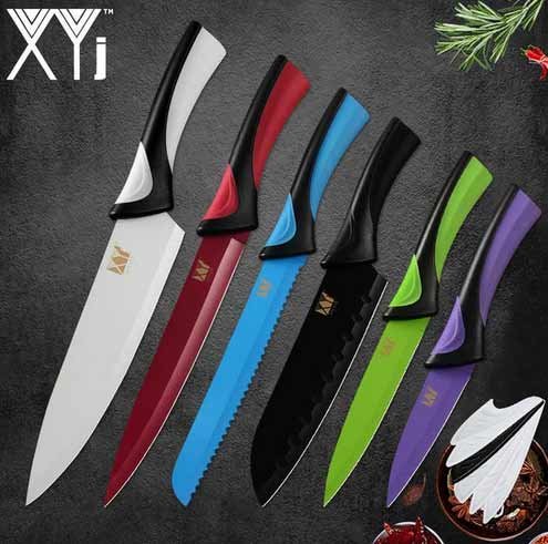Ako želite napuniti kuhinju jarkim bojama - nemojte proći pored ovog seta kuhinjskih noževa. Oni se prodaju na Aliexpress u drugačijoj konfiguraciji, kupac može odabrati prave alate za svoja kulinarska remek-djela. Ručke i noževi različitih boja. Oni su svijetli i neobični, izgledaju vrlo impresivno. Da, i kuhinjskih noževa nositi dobro sa svojim zadacima - rezne oštrice su oštre, metal je prilično teško, ne savijati tijekom rada.