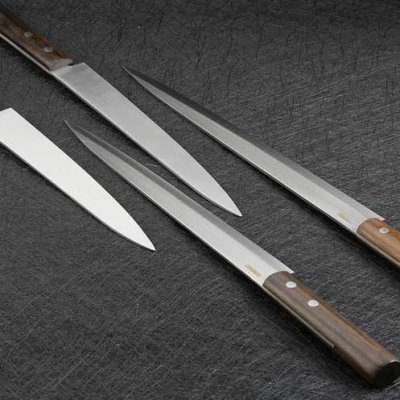 Ovi dugački i uski kuhinjski noževi imaju svoju specijalizaciju. To su alati za rezanje i rezanje ribe i plodova mora. Ispred tebe Europeanized modeli za kuhanje sashimi, oni su upoznati s našim ručkom. Oštrica u obliku lista vrbe najbolje je rezanje ribe na vrlo tanke kriške. Što je nož duži, to je praktičnije raditi s dugim trakama ribljeg filea. Uz takve alate, kriške su savršene.