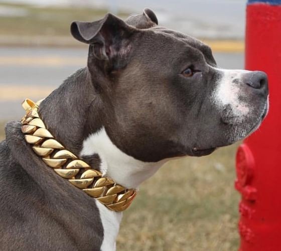 Ako više volite spektakularni pribor za vašeg ljubimca, onda će vam se svidjeti ova stvar. Ova ogrlica pogodna je za srednje i velike pasmine pasa. Ovo nije samo lanac, nego pravi lanac! I njezina težina je prikladna. Izrađena je od ovratnika od nehrđajućeg čelika. Boja je zlatna, srebrna i zlatna s crnim metalom. Veze su velike, sigurno povezane. To je najizdržljivija ogrlica za pse. Prodavatelj kaže da se s njim može i vući.