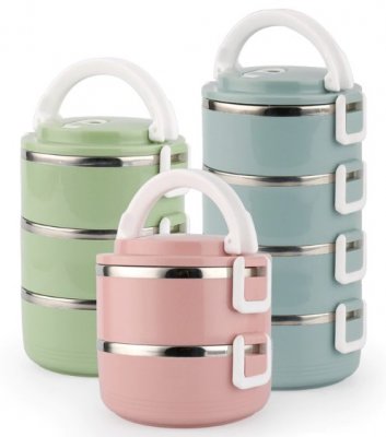 OUSSIRRO je višeslojni spremnik. Prodavatelj nudi izbor mnogih opcija za branje. Možete odabrati set s poklopcem, kutijom za ručak od dva, tri ili četiri sloja. Asortiman ima 3 pastelne boje - ružičastu, plavu i svijetlozelenu. Svi spremnici izrađeni su od nehrđajućeg čelika s premazom otpornim na toplinu, silikonskim brtvama. Gornji poklopac se čvrsto zatvara. Temperatura obroka održava se do dva sata, ako kutiju za ručak spremite u posebnu vrećicu - do 4 sata.