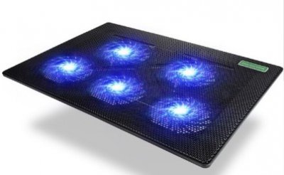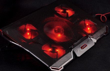 Jedan od najboljih izgleda za prijenosna računala u našem vrhu i na Aliexpress. Postoji 5 tihih ventilatora s ugrađenim crvenim pozadinskim osvjetljenjem i oni rade s USB 2.0. Proizvod se može koristiti na svim modelima s dijagonalom od 12 do 17,3 inča, što znači da, ako želite, na njega možete čak instalirati i vrhunska prijenosna računala.