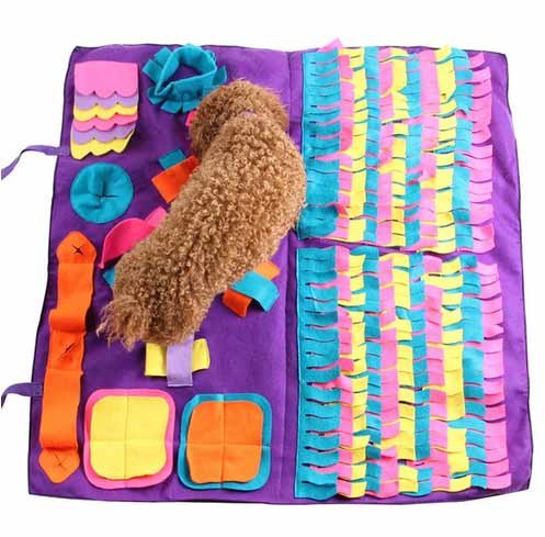 Najbolji način da se psa mentalno opterećuje je kupiti takvu tanjurić. Ovaj izum nizozemskih entuzijasta koristi se ne samo za hranjenje psa, već i za poticanje njegove aktivnosti u mozgu. Zadatak kućnog ljubimca - pronaći hranu, skrivenu u naborima i džepovima tepiha. S takvom igračkom možete povremeno rastegnuti vrijeme hranjenja. A pas neće biti lišen tako važnog dijela životinjskog života kao potraga za hranom. Ušiven je tepih od dobre runo. Mekan je, lako se briše u stroju. Postoje užad s kojima možete popraviti prostirku na podu.