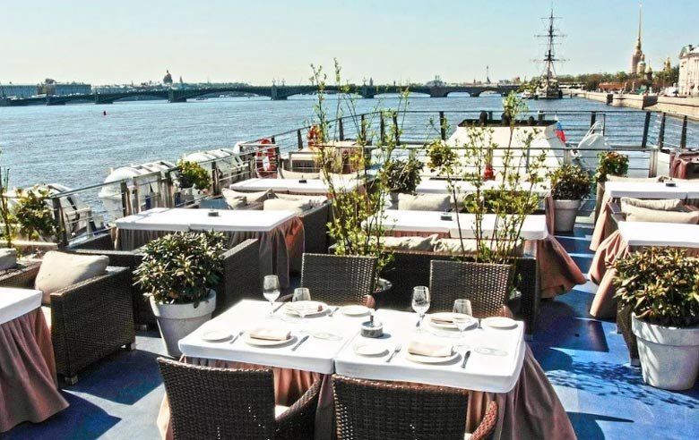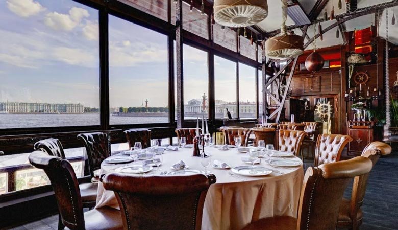 Što se tiče jelovnika, restoran će oduševiti svoje goste. Uključuje pan-azijsku, japansku kuhinju, talijanska, ruska jela, brazilsko meso na žaru i mnoge recepte s morskim plodovima. Posebno je predstavljena karta bara s velikim izborom jakog alkohola i vina. Online rezervacija dostupna je na licu mjesta. Glavne prednosti: prekrasan pogled na St. Petersburg, najbolje recenzije, visoka razina usluge, neobičan dizajn, restoran je na vodi. Nedostaci: visoki troškovi.