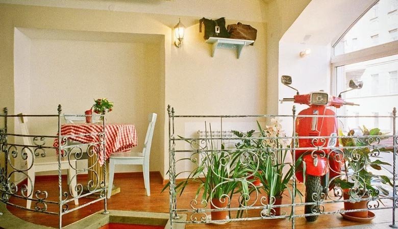 Mali, ali bučan kafić-restoran s veselom atmosferom i rock and roll zvučnicima nalazio se nedaleko od srca St. Petersburg-Nevsky Prospect. Vlasnici Italije, Elenu i Franca pripremaju se za goste i pažljivo prate kvalitetu hrane. Atmosfera ovdje je nevjerojatna - talijanski okus uz prave modele motocikala Ducati i Vespa, od kojih su mali posjetitelji posebno oduševljeni. Svaka marka posvećena je zasebnoj prostoriji. Stolovi s tradicionalnim kariranim stolnjacima u stilu letničkih talijanskih kafića - još jedan od "institucije".