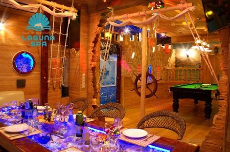 Zanimljiv know-how “Laguna” je uvođenje poklon bonova, koji predstavljaju cijeli niz tematskih usluga, plaćenih u jednom iznosu. Na primjer, odlična opcija za organiziranje sastanka s prijateljima prije vjenčanja može biti kupnja seta "Bachelor Adventure". Odabirom ove ekskluzivne ponude možete postati punopravni vlasnik Morske dvorane, posjetiti parnu sobu, probati nargilu i uživati u erotskom plesnom showu. U drugim danima, sauna je otvoren za sve oko sat, cijena po satu najma počinje od 2300 rubalja.
