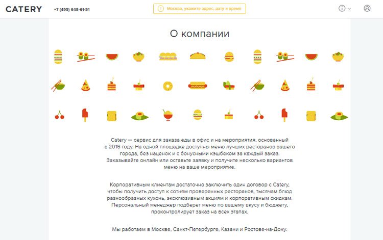 Catery ima zanimljivu uslugu: pretplata na hranu. Ako tvrtka planira redovito naručivati obroke u uredu, možete angažirati osobnog menadžera koji će odabrati jela za svakog zaposlenika. Za stalne kupce postoje posebne ponude i popusti za velike narudžbe. Catery je pogodan za sve novčanike i gotovo sve događaje. Smatrali smo blagi nedostatak nemogućnosti posluživanja velikih događaja od tisuću ljudi.