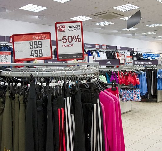 Adidas je zadovoljan ne samo redovitom prodajom u glavnim trgovinama, već i ugodnim popustima u trgovinama u Moskvi. To uključuje stavke iz prošlih zbirki koje su zadržale pristojnu kvalitetu. Za polovicu originalne cijene možete kupiti tenisice, sportsku odjeću i pribor. Cijene se kreću od 300 rubalja do nekoliko tisuća. Roditelji će cijeniti štand s dječjom odjećom i obućom. U zimskim mjesecima postoji mnogo sezonskih dodataka. Sam dućan ne izgleda kao popust, sve je izglačano i lijepo raspoređeno. Popusti se redovito mijenjaju, često nude 2 dobra po jednoj cijeni.