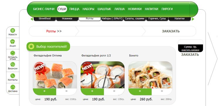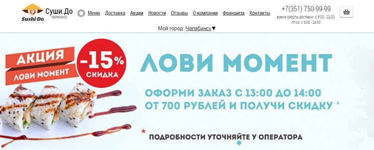 Mi smo stavili Sushi-Do na jednom od najvrjednijih mjesta - jedinstven za Chelyabinsk isporuku sushi i role po komadu. Naravno, tu su i poznati setovi, i setovi od 6, 8, 12 jedinica. Tvrtka je poznata po velikoj veličini rolni, a novi kupci su zadovoljni mogućnošću da istodobno isprobaju sve ukuse. Na stranici se govori o svježini proizvoda, kupci nemaju pritužbi na kvalitetu. Dostava je dostupna za narudžbe od 15 rubalja i varira od 100 do 200 rubalja, ovisno o području. Stalno postoje popusti, promocije i nagradne igre. Dostava je dostupna od 10 do 22 sata, možete naručiti i na web stranici iu jednoj od 26 točaka.