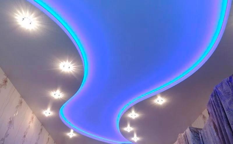 Učinak se također koristi u dizajnu na više razina s kombinacijom matiranih i sjajnih platna različitih boja. Ovdje možete stvoriti "lebdeći" gornji ili donji sloj, ovisno o smjeru svjetlosnog toka. Istodobno se koriste različiti profili koji osiguravaju potreban kut osvjetljenja. Baguete od fleksibilnih polimernih materijala koriste se za stvaranje zakrivljenih površina.