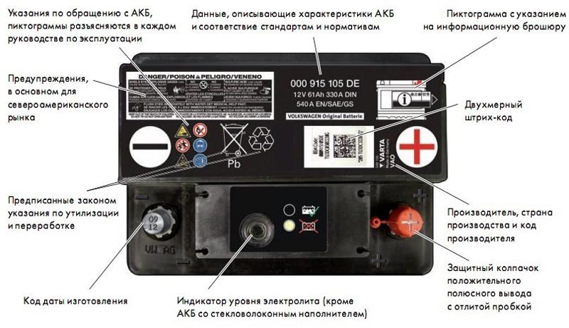 - početna struja označena je kao GOST (na akumulatorima proizvedenim u Rusiji), SAE (proizveden u SAD-u), EN (proizveden u zemljama Ujedinjene Europe), DIN (posebni standard za proizvode proizvedene u Njemačkoj). U nekim slučajevima, oni imaju kvantitativnu oznaku struje hladnog pokretanja (nakon ICC, CCA) i struje startnog punjenja (IP).