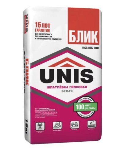 Najbolja opcija za proračunske završetke bit će upotreba Unis Blick kita. Ovaj sastav izrađen je na temelju prirodnih građevinskih materijala. Proizvođač preporučuje uporabu smjese za brtvljenje malih oštećenja i pukotina na različitim površinama. Plastična masa može se koristiti za ugradnju kade, umivaonika, WC školjki, itd. Glavno područje primjene kita je uređenje prostorija s povoljnom mikroklimom. Kompozicija nije prikladna za stvaranje premaza u vlažnim područjima i na fasadi zgrada. Za nanošenje velikog sloja kitova potrebno je nanijeti traku za pojačanje. Kod sušenja sloj za izravnavanje se ne skuplja.