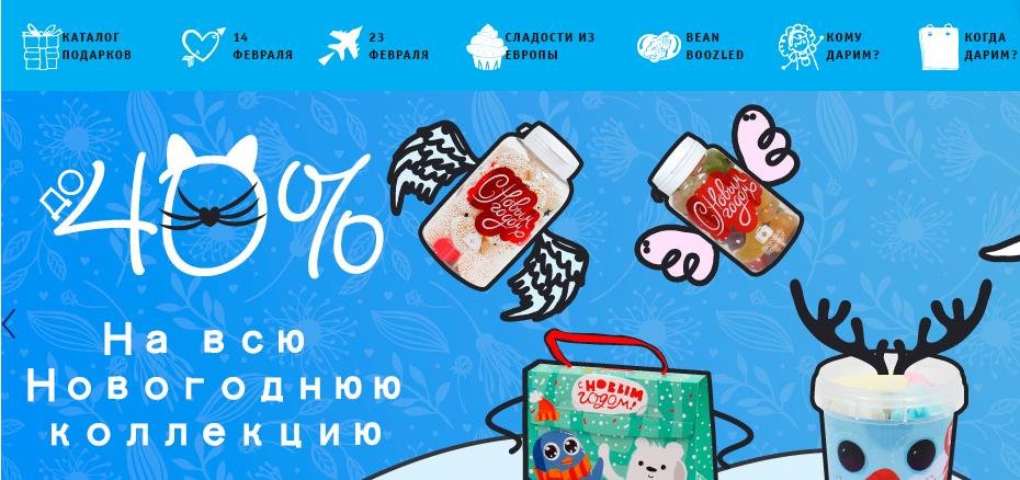 Trgovina ima jasno sučelje i najveći asortiman jestivih originalnih darova. Dostava je dostupna ne samo u Moskvi, već iu drugim regijama, pa čak iu zemljama. Možete odabrati iz cijelog seta slatkiša, poklon kava, čaj, kao i popularne Bean Boozled, Ljubav je, itd. Prednosti usluge su: dostupnost zgodan pretraživanje, jednostavno sučelje, svijetle dizajn, razumne cijene, promocije, praktične dostave. Nedostaci nisu pronađeni.