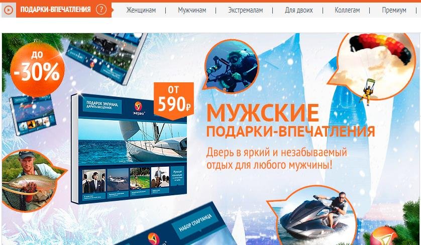 Emprana je usluga s darovima nove razine! U novije vrijeme to se nije moglo ni zamisliti. Stranica nudi jedinstvene certifikate s stvarnim pojavljivanjima za kupnju. Dobivate jednu od gotovih opcija, primjerice, "Hirove princeze", "Neka im zavide", "Muški lik", "Spartanski set", "Glazba srca", itd. U svakom od njih može se odabrati oko 10 dojmova, među kojima su masaža, zorbing, karting, streljaštvo, penjanje po stijenama, joga, skijanje, motorne sanke itd.