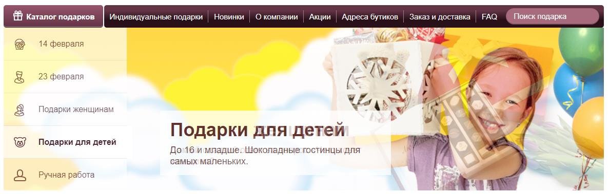 Stranica nudi tako veliki izbor da svatko može pokupiti originalni dar za svaku prigodu. Za narudžbu dovoljno je nekoliko klikova. Svaki dar se nudi za kupnju lijepe ambalaže. Među prednostima usluge, možete istaknuti najbogatiji asortiman, isporuku u bilo koju regiju, dobre recenzije. Nedostaci nisu pronađeni.