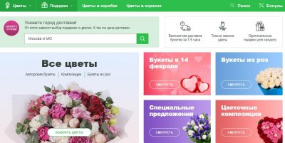 Stranica pruža jedinstvenu priliku da naručite svjež prekrasan buket u bilo koje doba godine iu bilo kojem gradu. Cvjećari dućan stvoriti nevjerojatno lijep cvjetni aranžmani, a također ih staviti u posebne košare. Kao poklon često daju lijepe karte. Prednosti: 24-satno prihvaćanje narudžbi, kupnja u nekoliko klikova, bilo koji oblik plaćanja, veliki izbor, jedinstvene skladbe. Nedostaci uključuju visoku cijenu buketa za regije.