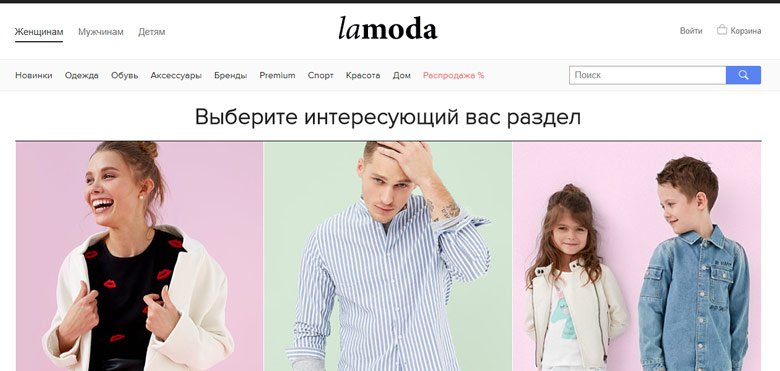 Katalog sadrži veliki izbor ženske, muške i dječje odjeće, kao i cipele i pribor. Ovdje možete pronaći gotovo sve. Stranica je osmišljena do najsitnijeg detalja: pored standardnih filtera (materijal, boja, trošak), postoje i filteri po modelima, otisci, uzorci. Pretraživanje Lamoda je vrlo brzo i praktično. Dostupni su kao skupe robne marke i odjeća po niskoj cijeni. Prednosti: najpopularnija online trgovina, besplatna dostava putem kurira, mogućnost isprobavanja prije kupnje, veliki asortiman, izvrsne recenzije.