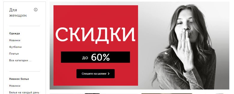 - Jasan sučelje. Lakše je navigirati web-lokacijom, brže ćete pronaći pravu stvar. Vrlo je prikladno kada se na glavnoj stranici nalaze najprofitabilnije promocije, a pristup važnim stavkama kao što su "dostava i plaćanje" nalaze se na istaknutom mjestu. Kupcima se sviđa mogućnost kupnje odjeće u jednom kliku, što je na nekim resursima.