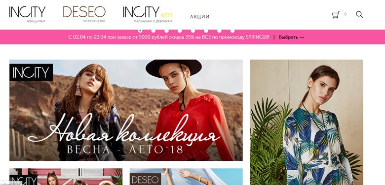 Mono-brand internetska trgovina razlikuje se od popularne u Rusiji odjeće mreže INCITY uz dobru kombinaciju cijene i kvalitete robe. Stranica sadrži sve modele novih i starih kolekcija po najpovoljnijim cjenovnim oznakama. Postoji mnogo haljina, suknji, bluza, traperica, čak postoje cipele i pribor. U trgovini možete kupiti donje rublje i odjeću za dom. Redovita prodaja povoljno razlikuje usluge od ostalih. Tijekom njih često nailaze na stvari s popustom do 90%.