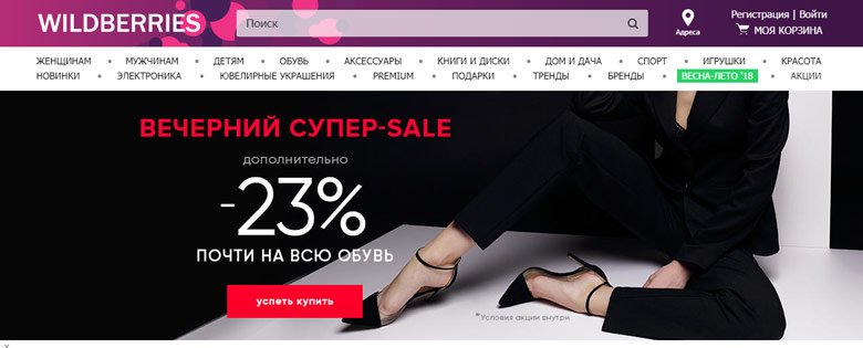 Wildberries je još jedan popularan resurs u Rusiji koji isporučuje u bilo koji kutak zemlje. Njegova glavna značajka je veliki asortiman odjeće i druge robe (više od 100.000). Postoji oko 1900 različitih marki, ovdje možete kupiti kombinezon, medicinsku odjeću, velike predmete, kao i za trudnice. U katalogu se nalaze proizvodi za dom. Na stranici se redovito održavaju zanimljive promocije. Na njima možete kupiti sve uz popust do 50%