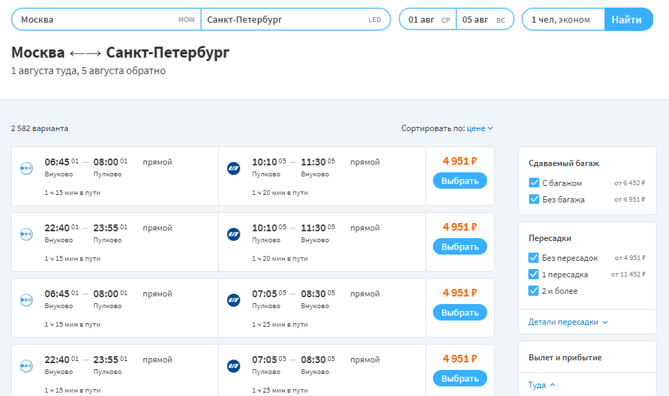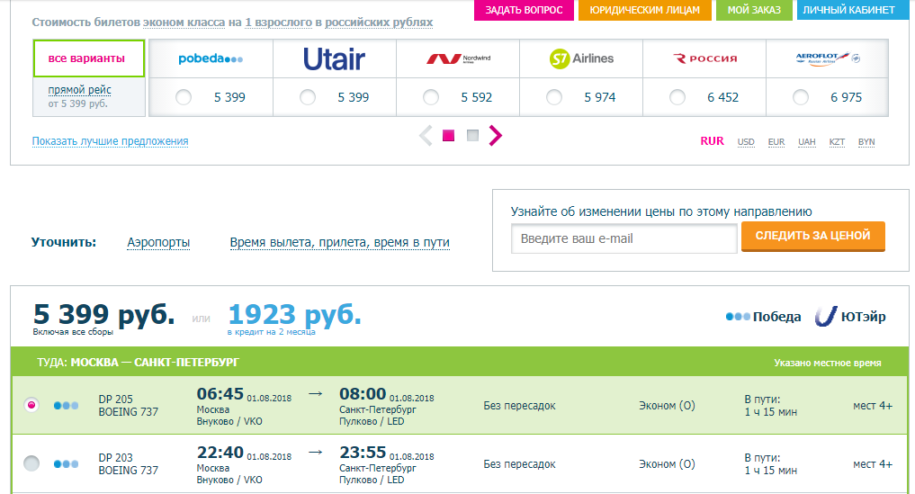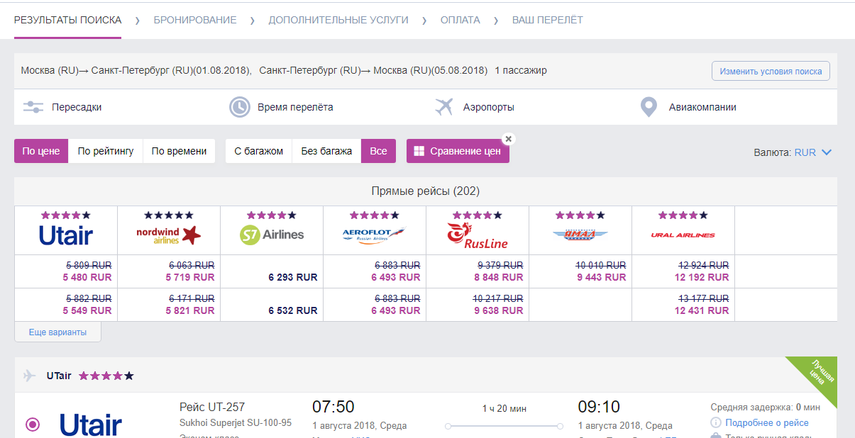 Radi praktičnosti, postoji cijela tablica usporedbi cijena među najrelevantnijim ponudama zrakoplovnih tvrtki. Na svakom letu se navodi potpuna informacija, pa čak i vrijeme prosječnog kašnjenja. Na početku popisa uvijek su prikazane najbolje ulaznice za cijenu i vrijeme leta. Svaki putnik može odabrati željenu cijenu na temelju količine prtljage, ručne prtljage i mogućnosti promjene datuma odlaska. Ako letite ili letite u Moskvu, onda je na mjestu prikladno odmah dobiti ulaznice za aeroexpress. Svaki klijent dobiva pristup osobnom računu. Glavne prednosti: zgodan sustav pretraživanja, mogućnost rezervacije smještaja, jeftine karte, dobre recenzije kupaca.