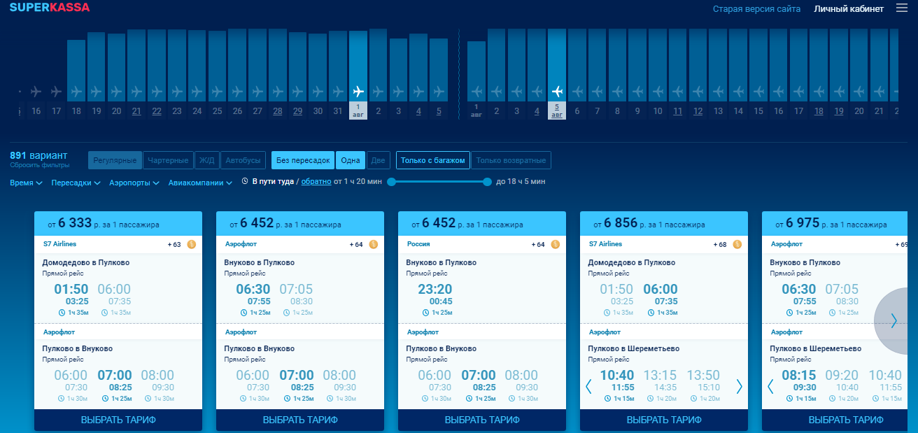 SuperKassa.ru web stranica je vrlo zgodan resurs za pretraživanje i kupnju zrakoplovnih karata. Nakon izdavanja rezultata, kupac ima mogućnost odrediti potrebne karakteristike: redoviti ili čarter let, sa ili bez transfera, sa ili bez prtljage, povratne ili ne, vrijeme putovanja, zračne luke, zračne luke Sve to omogućuje brzo i jednostavno pronalaženje najprikladnijih ulaznica. Važna značajka stranice - ako je potrebno, možete stvoriti složen put, koji se sastoji od nekoliko smjerova odjednom. Osim toga, gotovo svaki prijevoznik nudi nekoliko karata koje možete izabrati. Razlikuju se dopuštene količine prtljage i ručne prtljage, mogućnost razmjene, povratka i razine udobnosti tijekom leta.