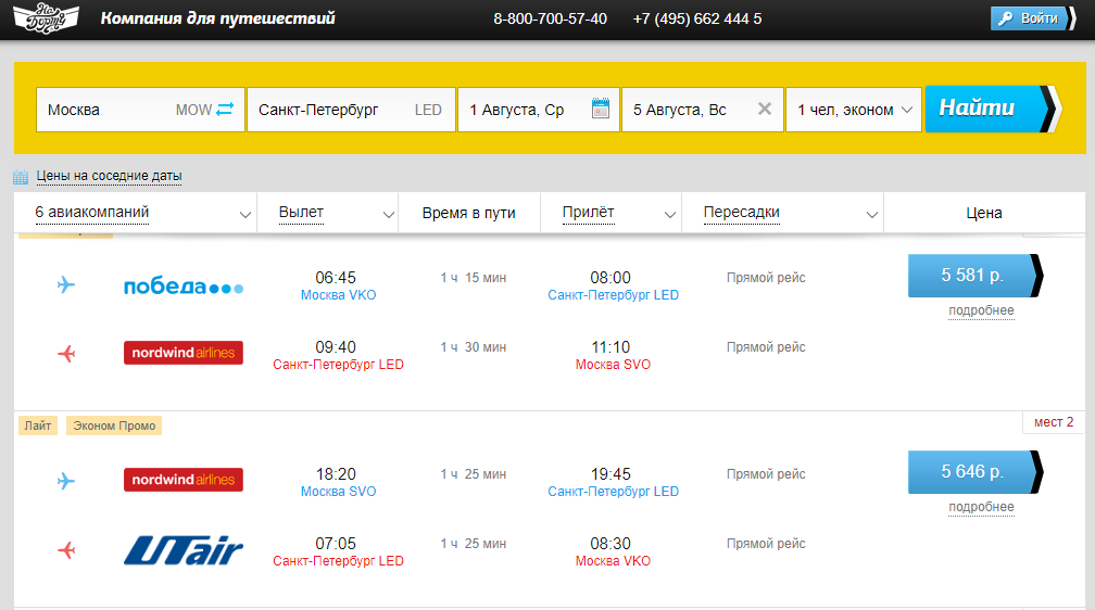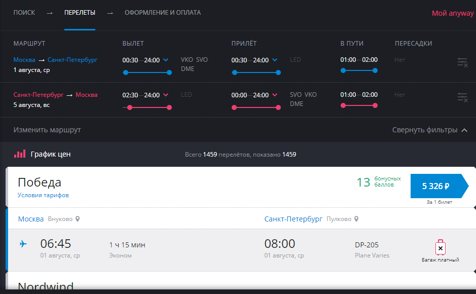 Online usluga AnyWayAnyDay.com najveća je u Rusiji, ima predstavništva izvan nje (SAD, Švicarska) i nudi kupnju avionskih karata po konkurentnim cijenama. Važna točka - prosječno vrijeme provedeno na pretraživanju, odabiru i kupnji je samo 3 minute. To je zbog jednostavne navigacije, brze usluge i user-friendly sučelja. Prilikom pretraživanja najprije vidite najoptimalnije ponude, a na lijevoj strani možete vidjeti avio karte drugih zrakoplovnih tvrtki po višoj cijeni.