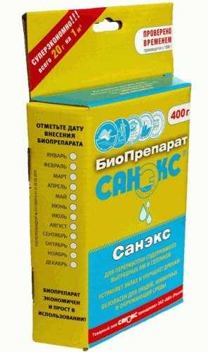 Zaštitni znak Sanex registriran je u moskovskoj tvrtki K & K. Proizvodnja lijekova provodi se u Poljskoj prema licenciranoj tehnologiji. U prodaji možete pronaći nekoliko lijekova pod markom Sanex. To su sredstva za održavanje septičkih jama, otpadnih uređaja, bio-pojačivača za kompost. Proizvođač je uspio pronaći sredinu između pristupačne cijene i pristojne kvalitete. Dakle, broj potrošača u Rusiji stalno raste. Za razgradnju otpadnih voda u septičkim jamama i septičkim jamama najprikladnija je Sanex težine 400 g. Korisnici razrjeđuju 2 žlice. žlice u toploj vodi bez kloriranja od 5 litara. Pripremljena otopina se ulijeva u septičku jamu, gdje bakterije djeluju mjesec dana.