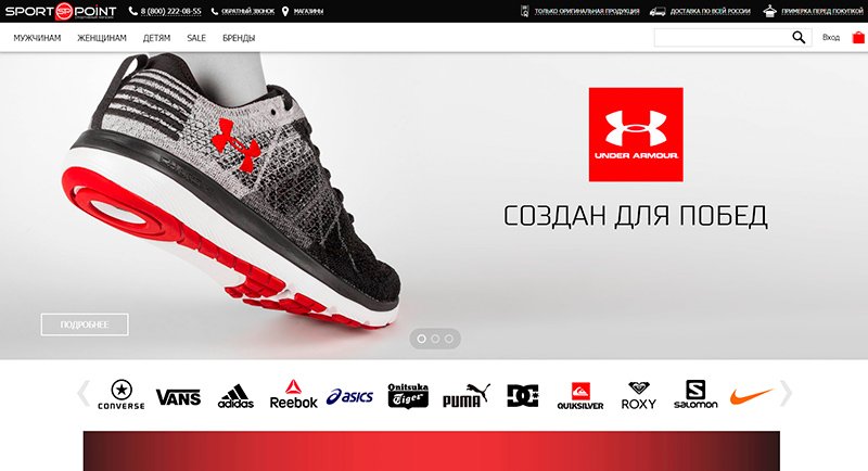 Nastavljamo s pregledom još jedne vrijedne trgovine sportske opreme, koja je u svom katalogu sakupila kolekcije najpoznatijih svjetskih brandova - Nike, Under Armour, Puma, Adidas, ASICS, Vans, Reebok i druge poznate robne marke. Stranica sportpoint.ru predstavlja veliki izbor udobnih, kvalitetnih i relevantnih modela odjeće i obuće, tako da kupci ovog resursa nisu samo sportaši, već i obični građani koji vole sportski stil u svakodnevnom životu.