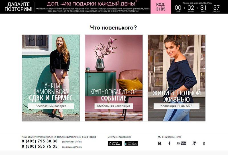 Francuska tvrtka La Redoute, specijalizirana za prodaju na daljinu, radi u Rusiji već više od 10 godina, a za to vrijeme uspjela je osvojiti titulu jednog od najboljih dobavljača kvalitetne i originalne pret-a-porte. Postoji velika zbirka predmeta ženske i muške garderobe, kao i odličan izbor dječjih i tinejdžerskih stvari - od rođenja do 16 godina.